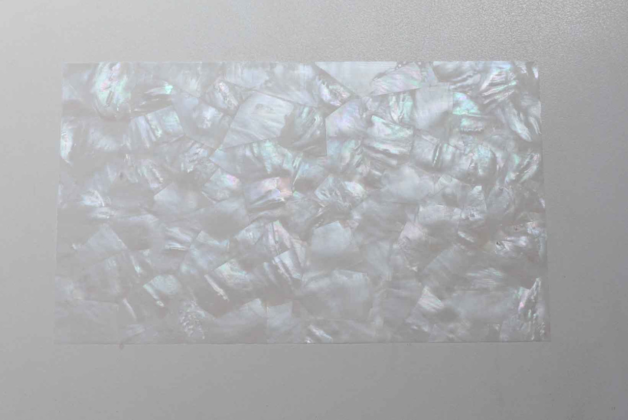 White Mother of Pearl laminated sheets are made from genuine shell. Each sheet has shell throughout consisting of layers of smaller shell pcs. Sheet size 235 x 135mm - 9.25 x 5.3inches. Thickness can be selected from listed products or made to order.