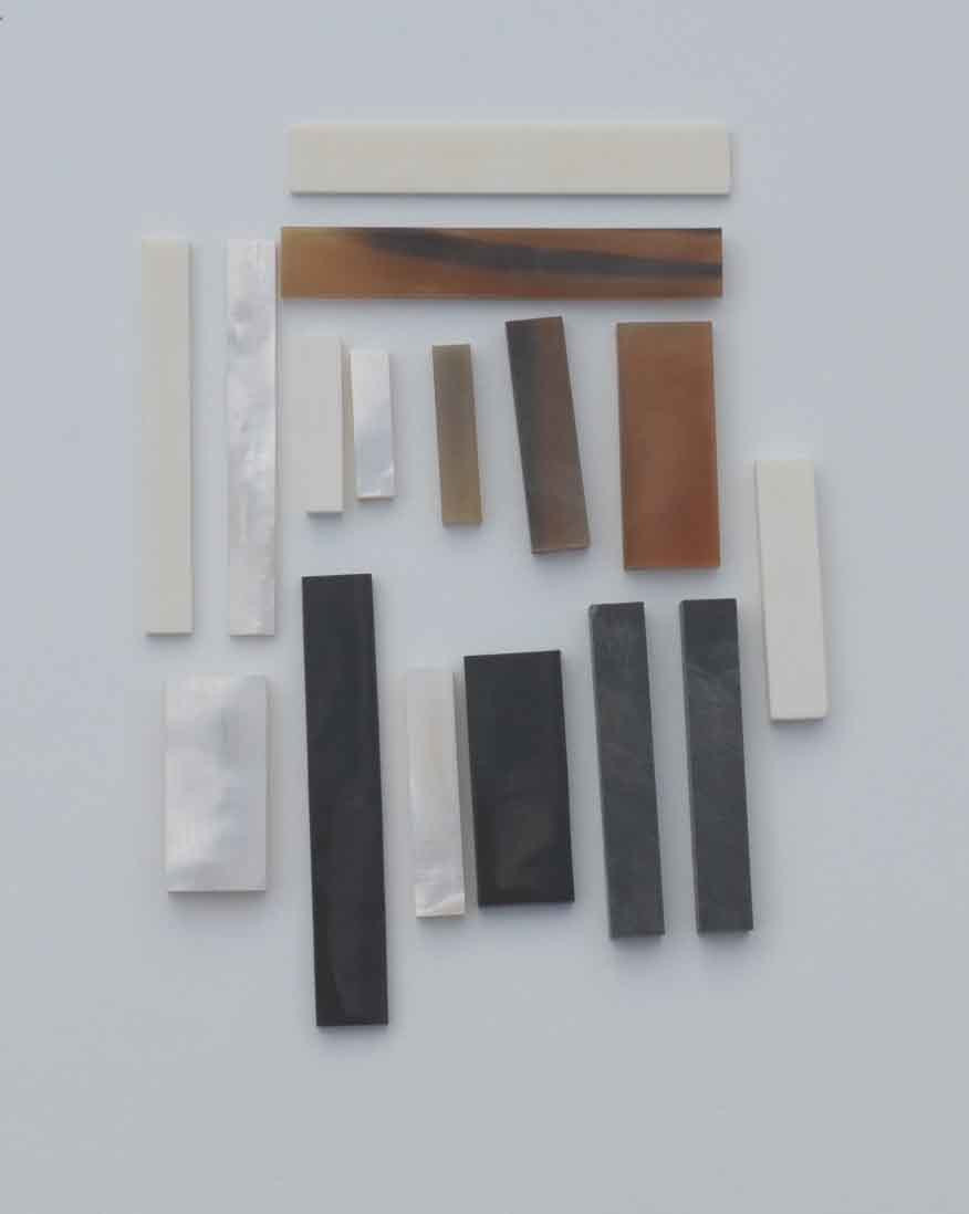Nut and saddle blanks used in musical instruments i.e. guitars, mandolins, ukuleles etc. Available in various materials bone, mother of pear, buffalo horn, mammoth ivory, stone. We stock some popular sizes and can custom cut special sizes based on material limitations.