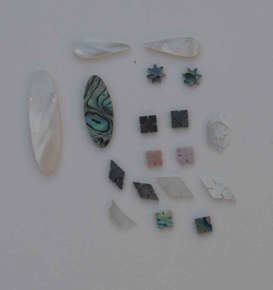 Shell inlay precut shapes. Various designs available. Used for fretboard markers, furniture, decorations. Choose from stocked items or ask us about custom cut motifs.
